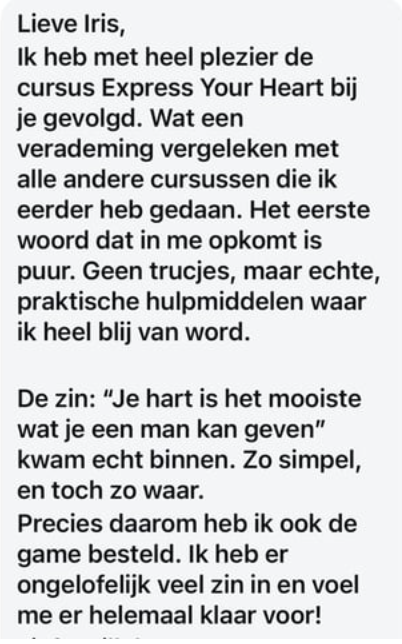 En ook nog eens om o.a. scherp, liefdevol, vrouwelijk en uitnodigend je grenzen, verlangens en gevoelens uit te spreken in de liefde, zodat je niet meer zijn angsten aanspreekt maar zijn verlangens naar jou.